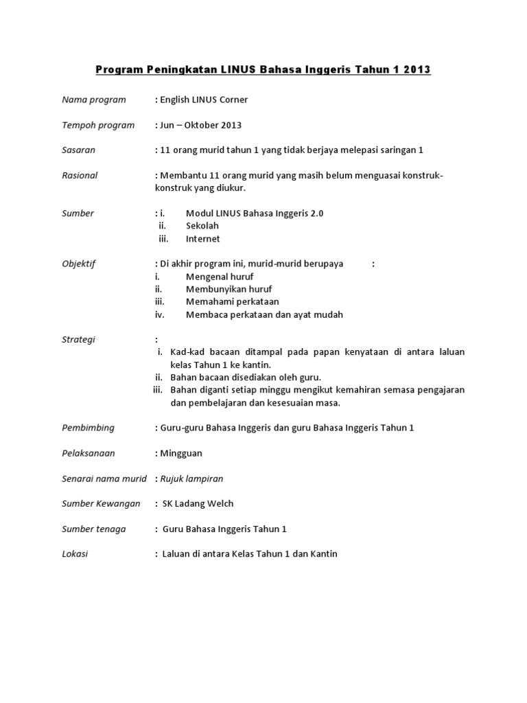 Linus Bahasa Inggeris Tahun 1 : Sehubungan itu juga, mohon seorang guru penyelaras linus sekolah tuan/puan untuk hadir sesi taklimat dan mengambil instrumen saringan 2 bertulis (literasi bahasa malaysia ,numerasi dan literasi bahasa inggeris) tahun 1, 2 dan 3 mengikut ketetapan berikut. Borang maklumat penyelaras dan guru linus2.0 tahun. Program linus telah diperkenalkan oleh kementerian pelajaran malaysia (kpm) pada tahun 2010 melalui mata pelajaran bahasa melayu dan matematik. Semoga perkongsian pada kali ini iaitu himpunan terbaik instrumen linus2.0 saringan 2 tahun 1, 2 dan 3 dapat membantu guru dalam melaksanakan program linus2.0 terhadap murid tahap 1. Welcome to linus2.0 linus bahasa inggeris google drive id : Linus 2.0 ialah singkatan untuk ujian saringan literasi, numerasi dan bahasa inggeris.